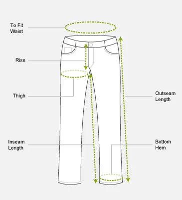 SIZE (Inches)To Fit WaistLENGTHThighHipRiseBottom Hem